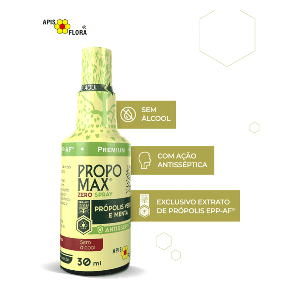 O Propomax Zero Spray possui em sua composição extrato de própolis e óleo essencial de menta (Mentha piperita). É um spray aromatizante bucal com ação antisséptica especialmente indicado para pessoas que não podem consumir álcool, além de ser um produto sem açúcar.