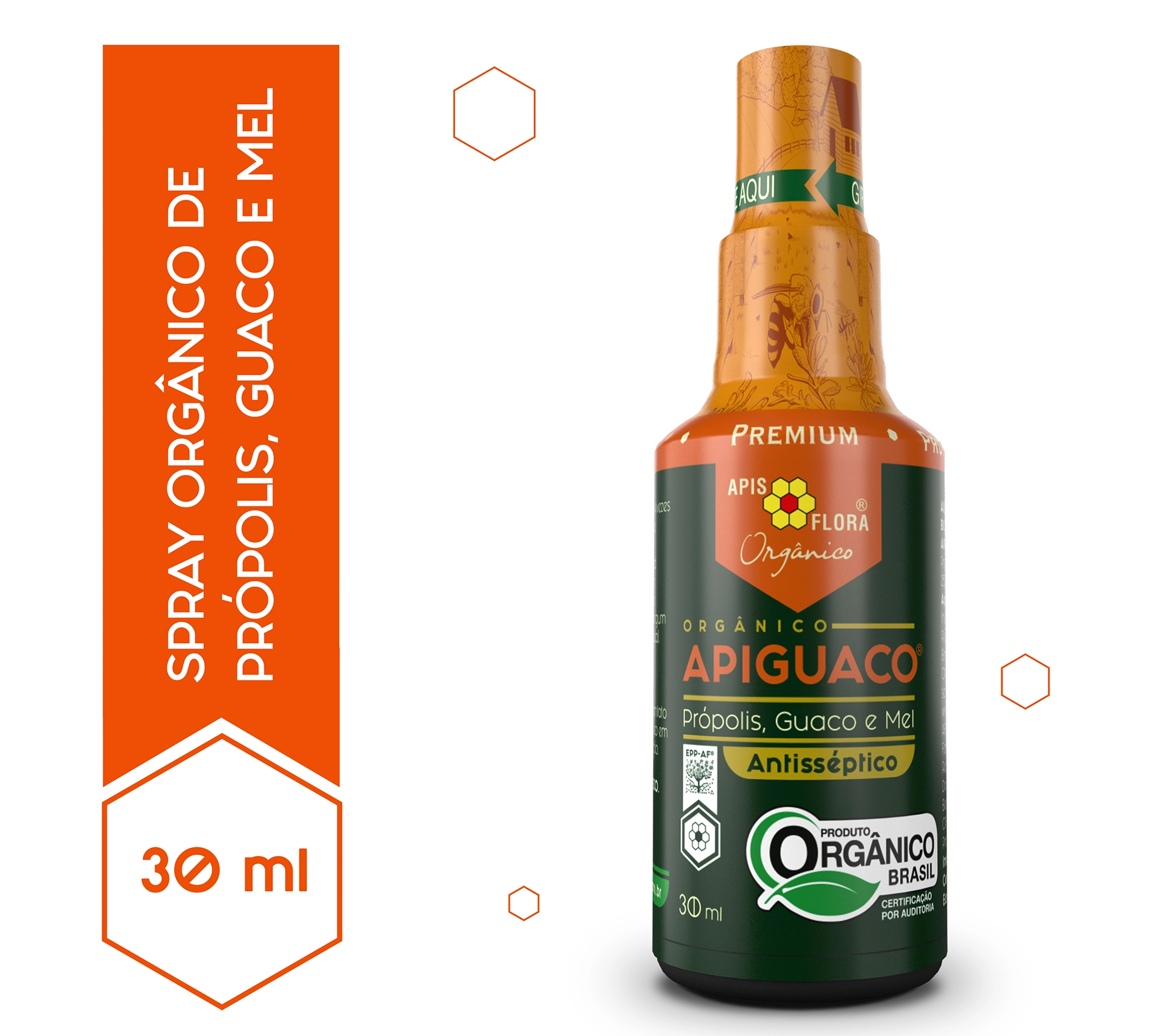 O Apiguaco® Orgânico é um spray antisséptico bucal à base de extrato de própolis, mel polifloral e extrato de guaco (Mikania glomerata).