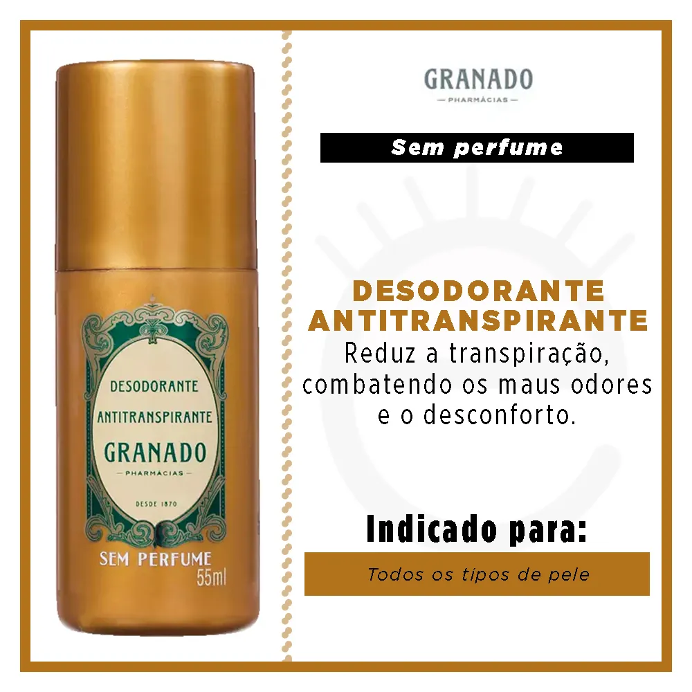 Desodorante roll-on unissex. Reduz a transpiração, combatendo os maus odores e o desconforto. Com Granado Tradicional Desodorante Antitranspirante você aproveita cada segundo do seu dia despreocupado, afinal, ele garante uma proteção eficaz.
