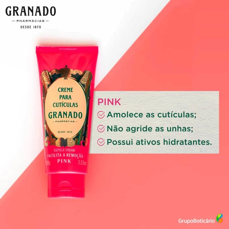 Creme hidratante para cutículas. De fórmula emoliente, hidrata e amacia a pele. Dessa forma, Granado Pink Creme para Cutículas facilita a sua remoção ou permite empurrá-la com facilidade, sem retirar a proteção ao redor das unhas.