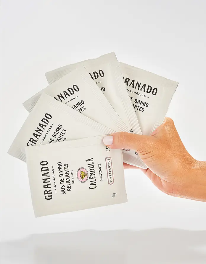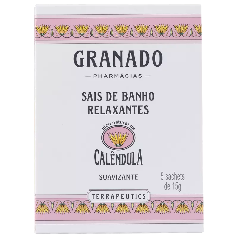 Sais de Banho Terrapeutics Calêndula 5 x 15g promovem relaxamento e bem-estar. Formulados com cristais de sal marinho e alta concentração de extrato natural de calêndula, que acalma a pele. Podem ser usados na banheira, no chuveiro ou como escalda-pés. Livres de parabenos, corantes e ingredientes de origem animal.
