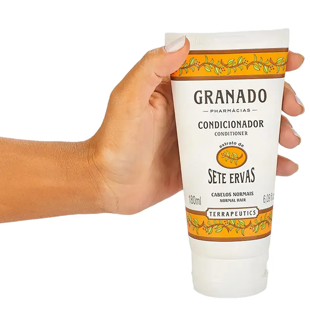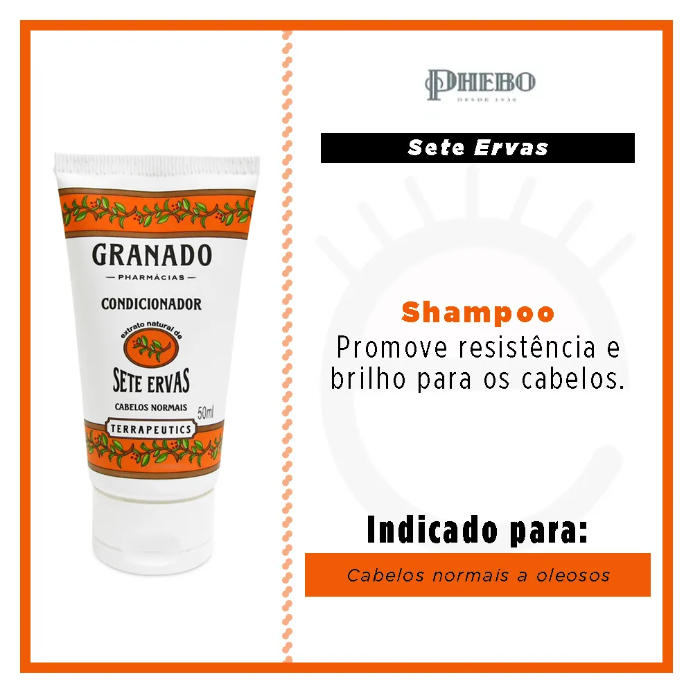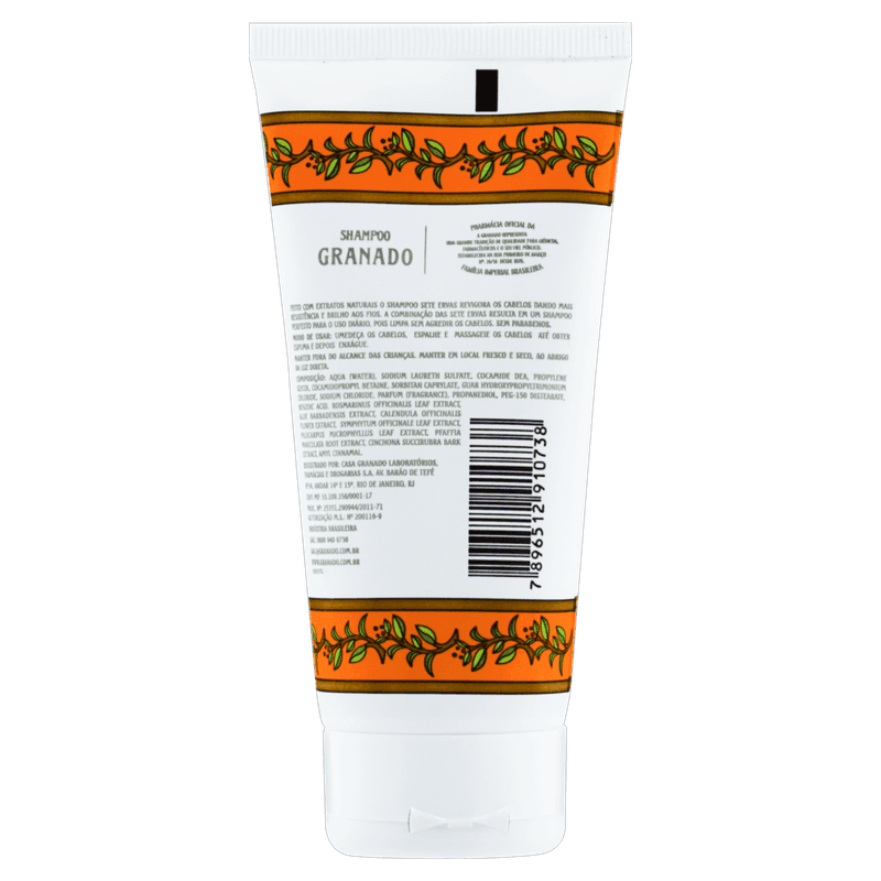 Shampoo Granado Sete Ervas 180ml oferece resistência e brilho para cabelos normais. Formulado com alta concentração de extratos naturais de alecrim, aloe, calêndula, confrey, jaborandi, ginseng e quina, proporciona limpeza suave e perfumação prolongada. Possui fórmula biodegradável, livre de parabenos e ingredientes de origem animal.