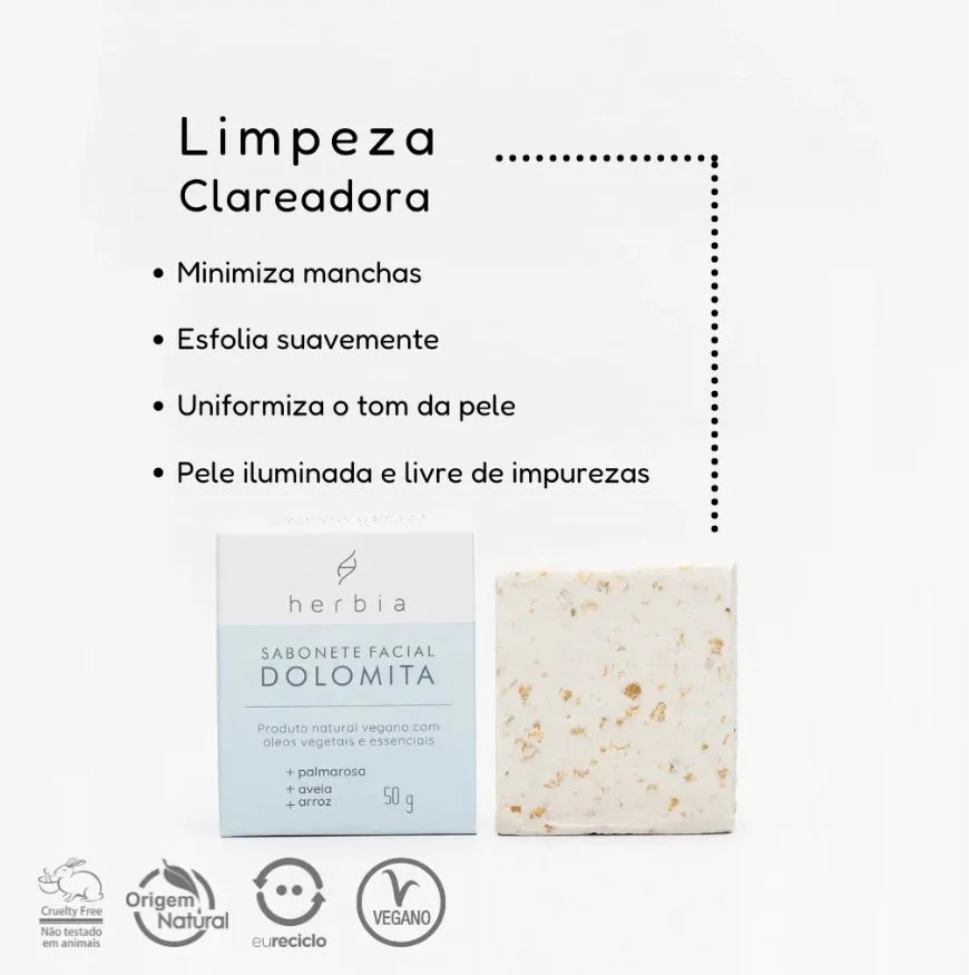 O Sabonete Facial Natural Dolomita da Herbia contém Dolomita, Aveia, Arroz e Óleo Essencial de Palmarosa como principais ingredientes que permitem uma leve ação esfoliante, podendo ser usado diariamente, uniformizando o tom da pele e mantendo-a iluminada e livre de impurezas.