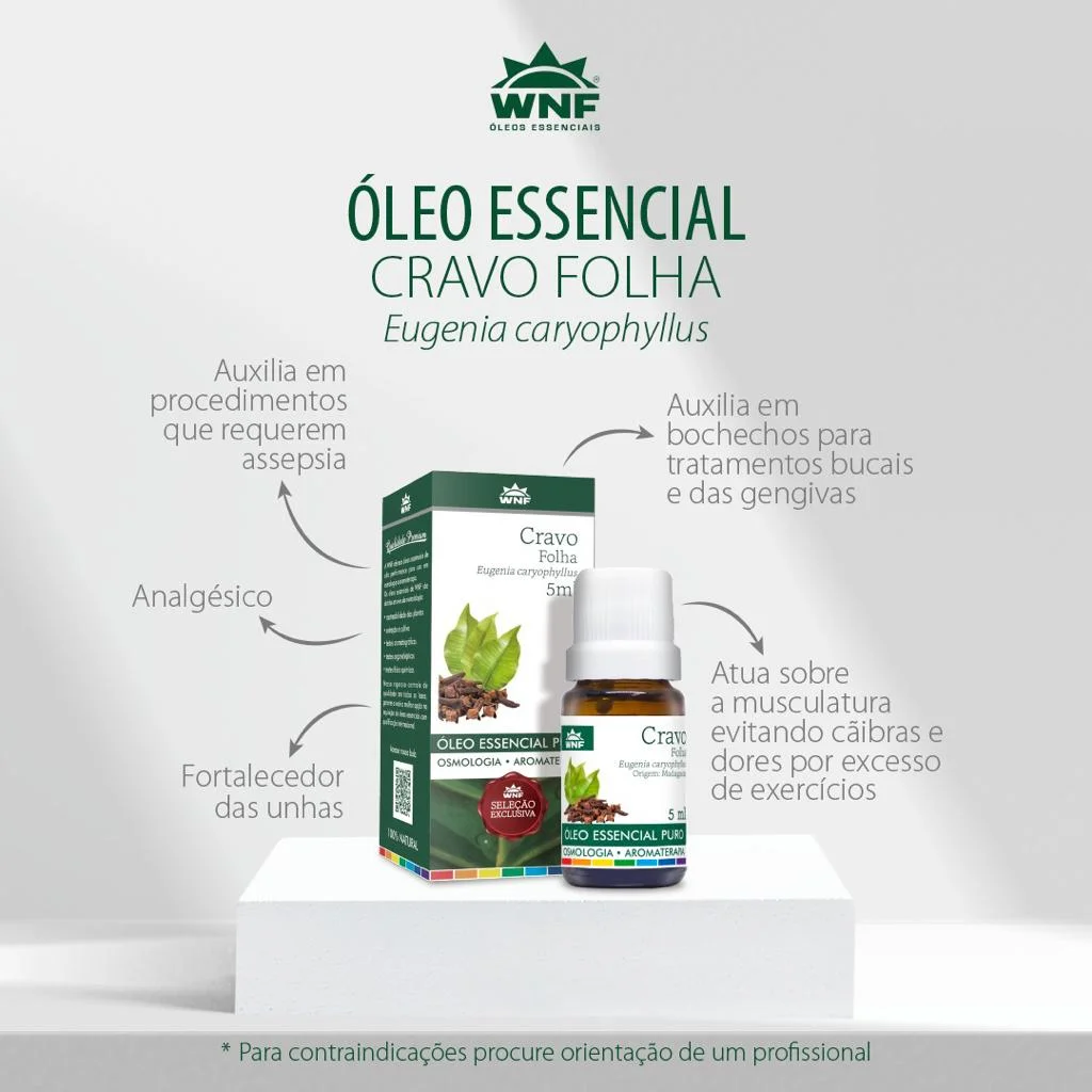O óleo essencial de Cravo Folha – Eugenia caryophyllus, quando aplicado em vários segmentos, auxilia em procedimentos que requerem assepsia, em bochechos para tratamentos bucais e das gengivas, sobre unhas enfraquecidas ou contaminadas, sobre verrugas. Ele age como revigorante, fortalece e aquece o corpo, proporcionando força e resistência físicas.