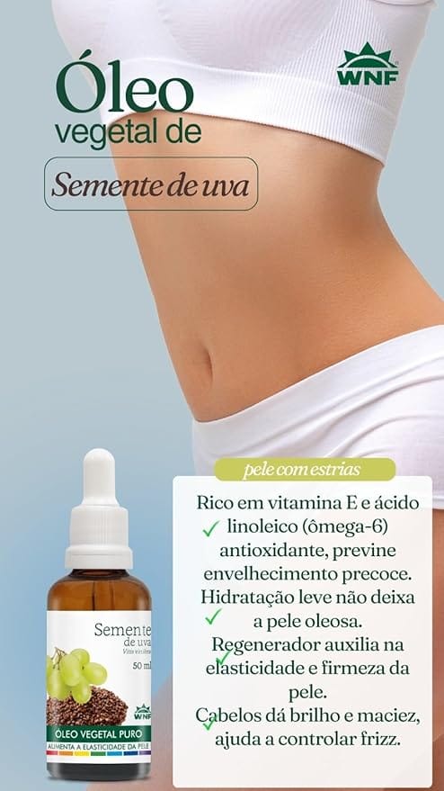 • Descubra os benefícios do cuidado natural e eficaz com o Óleo Vegetal de Semente de Uva WNF, o aliado perfeito para hidratação, elasticidade e prevenção de estrias, especialmente durante a gravidez!